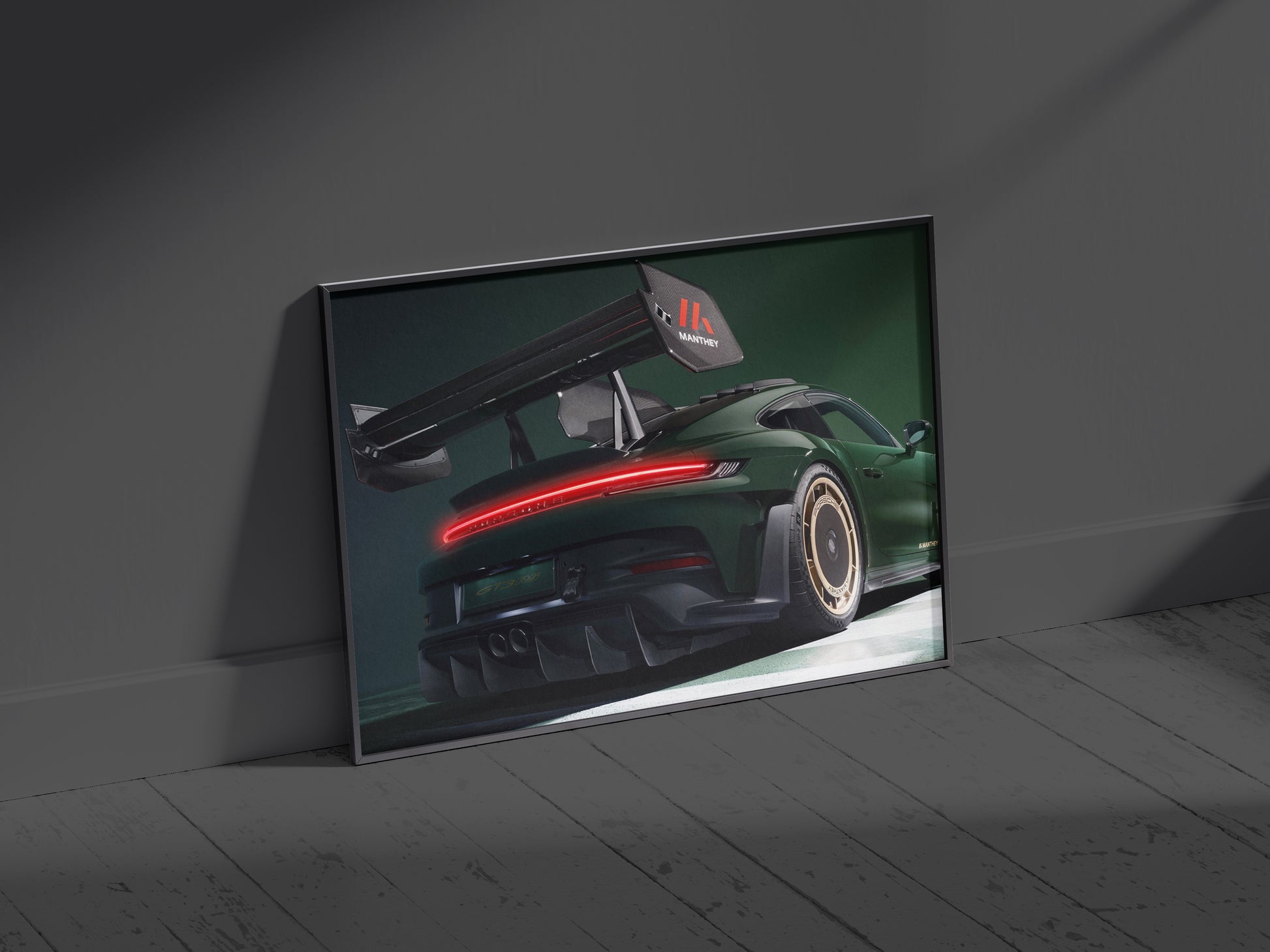 Celebrate the pinnacle of track performance with this Porsche 911 GT3 RS Manthey Racing Acrylic Neo LED frame. This stunning piece showcases the aggressive rear profile and massive wing of the world’s most formidable street-legal track car.